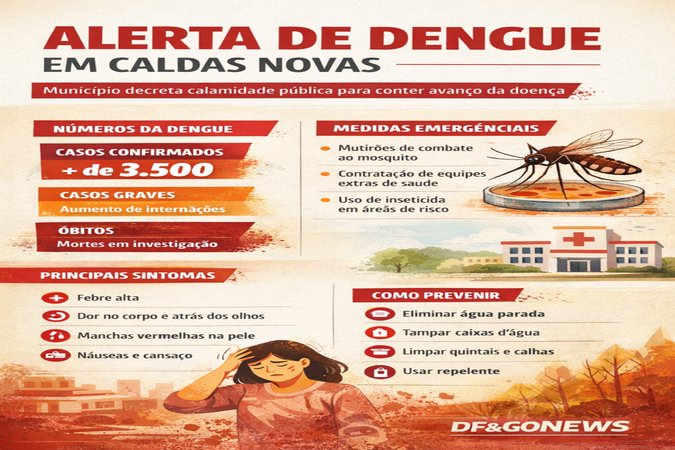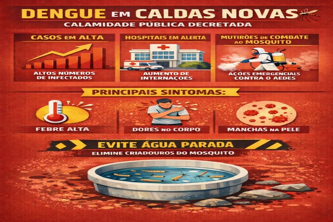 A Prefeitura de Caldas Novas, um dos principais destinos turísticos de Goiás, decretou situação de calamidade pública em decorrência do crescimento acelerado dos casos de dengue registrados no município. A decisão foi tomada após avaliações técnicas da Secretaria Municipal de Saúde, que apontaram risco de colapso no atendimento médico caso medidas emergenciais não fossem adotadas.